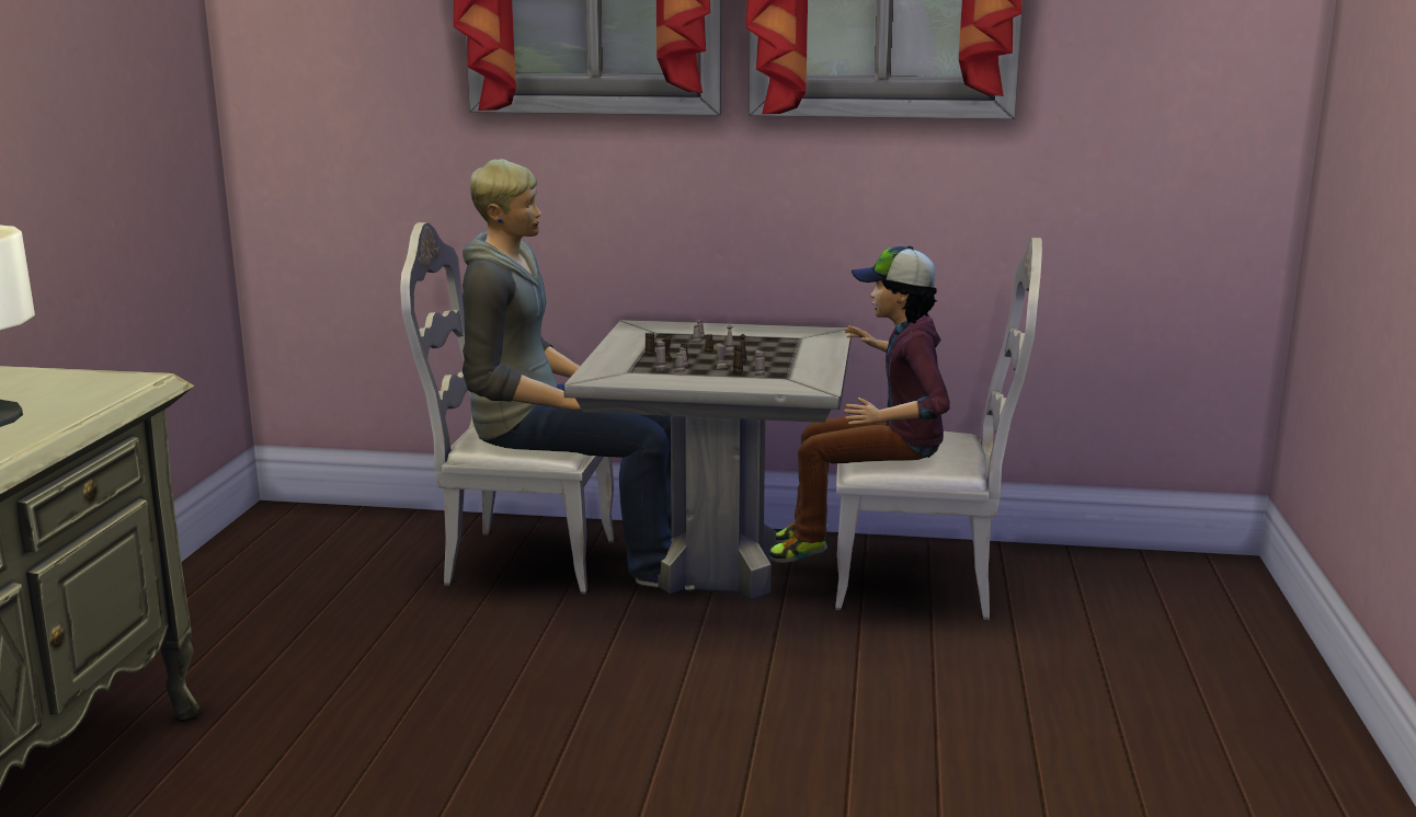 Haru has the Whiz Kid aspiration and he needs to play five games of chess. Ryu helps him out when he gets the chance. (I’m finding it easier to complete the chess game count in Sims 4 than Sims 3.)