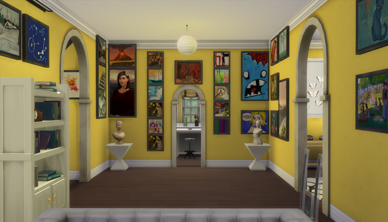 With the addition of a new upstairs, the only room on the main floor to get a slight remodel (but not really) is the family room. Michiru now has an art studio upstairs and we placed a couple of statues among the paintings.